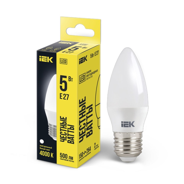 Лампа светодиодная iEK C35 свеча 5Вт(40Вт) 450лм E27 Н/С (4000K)
